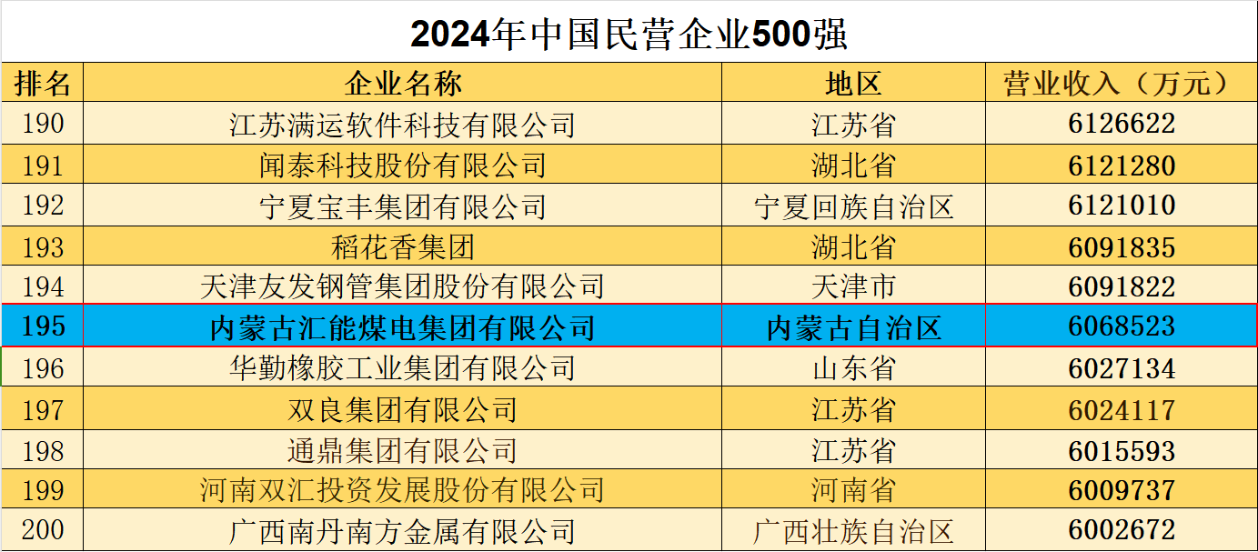 10 月 12 日,全国工商联发布 2024 中国民营企业 500 强报告并公布榜单。汇能控股集团有限公司(原内蒙古汇能煤电集团有限公司)位列榜单195位,较2023年的240位前进44位。